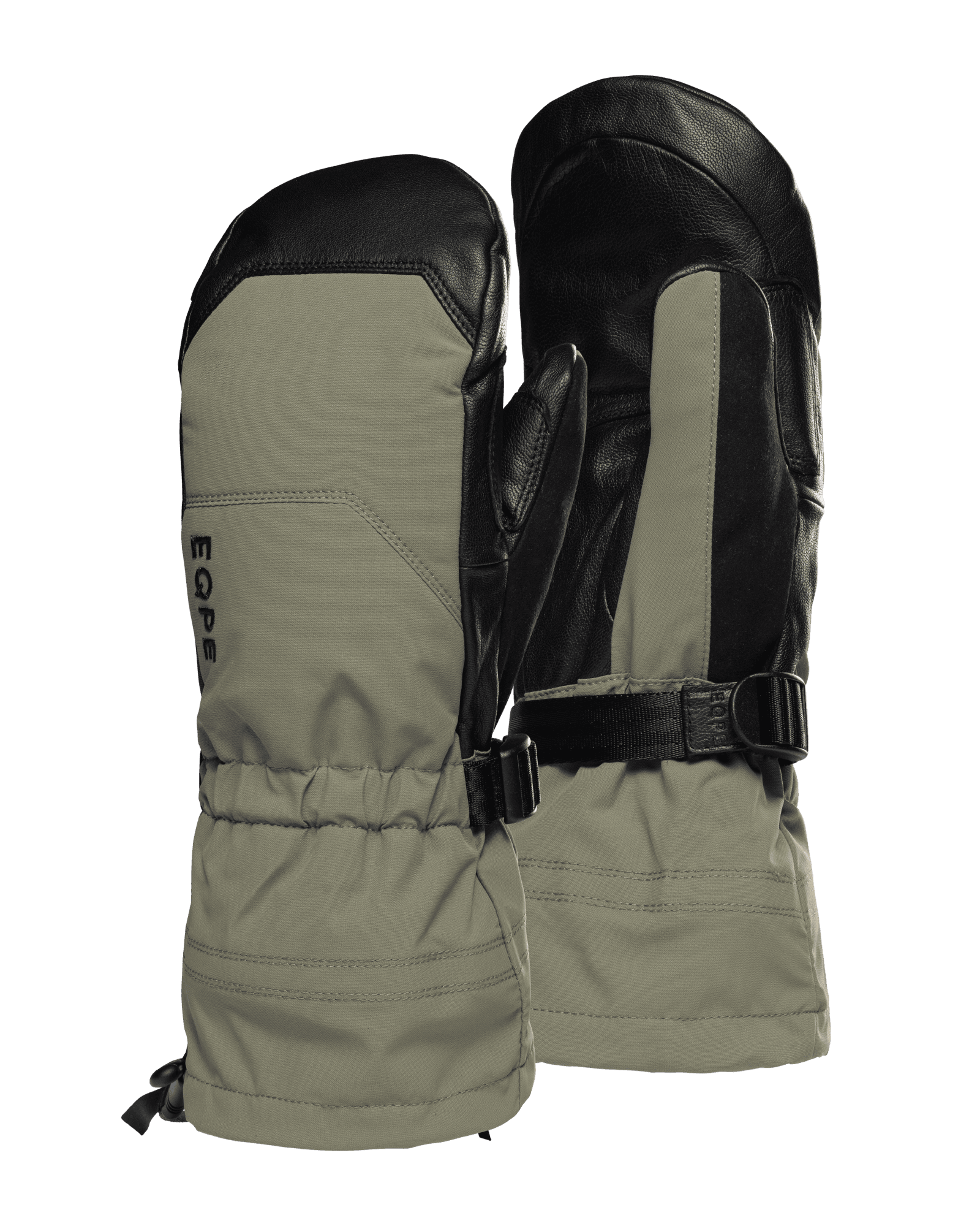 Thumb mittens with an outer shell of treated goatskin combined with water-repellent synthetic material. A long cuff extends over the jacket sleeve for extra protection, while a removable insulated lining provides warmth and protects against moisture and cold.